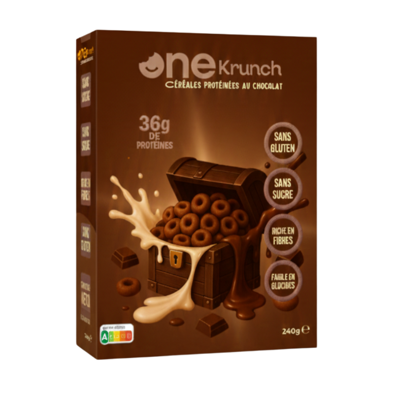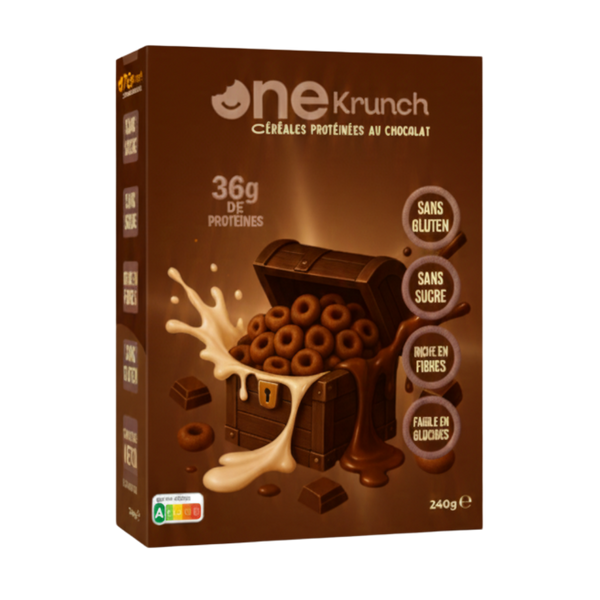 OneKrunch, c’est des céréales ultra gourmandes mais pensées comme un vrai snack fonctionnel : riches en protéines végétales, très peu sucrées, avec un Nutri-Score A. En gros, le plaisir d’un bol de céréales “enfant”, avec une recette d’adulte qui fait attention à sa santé.