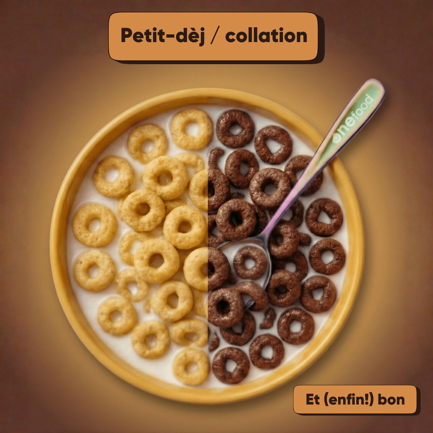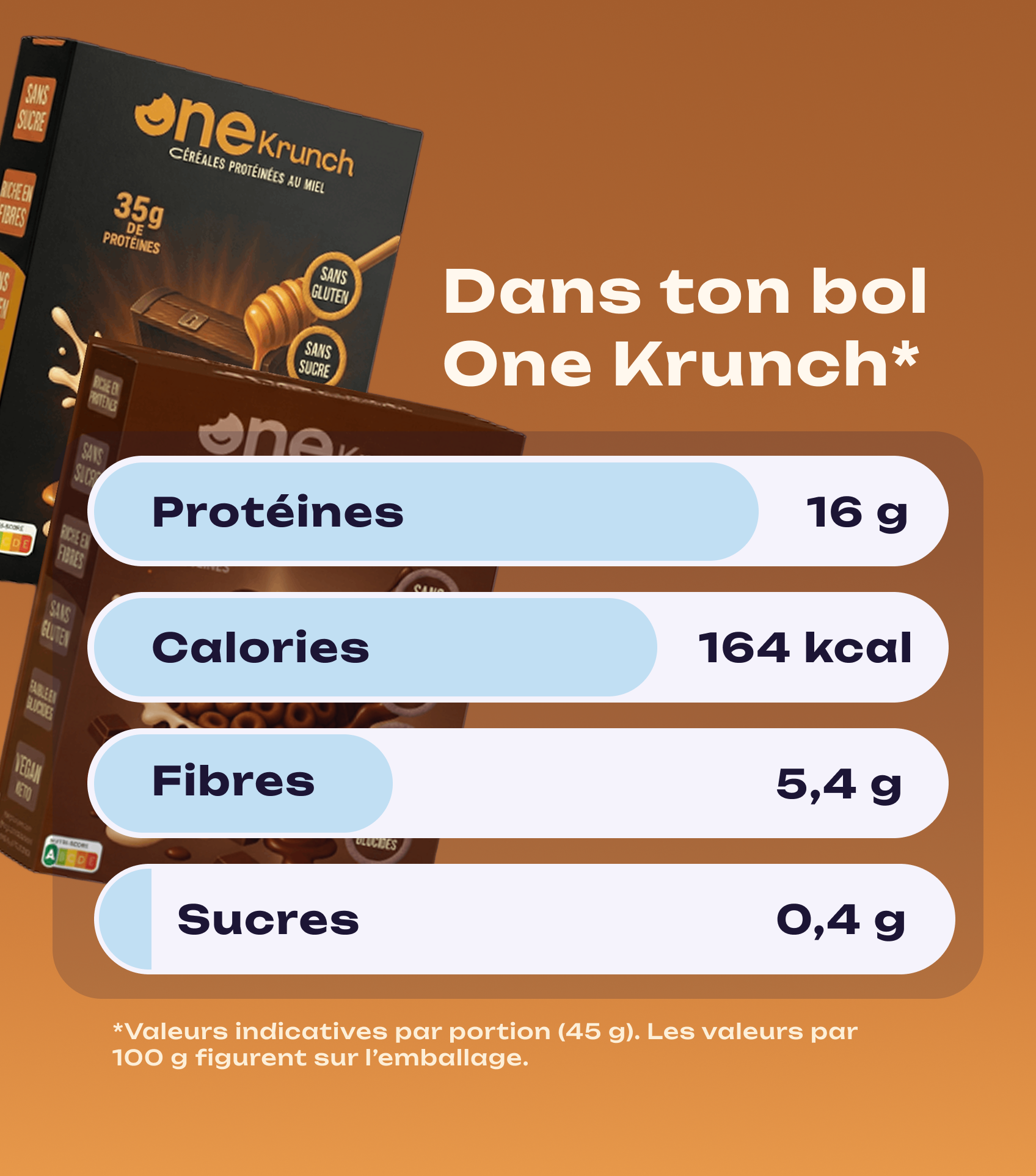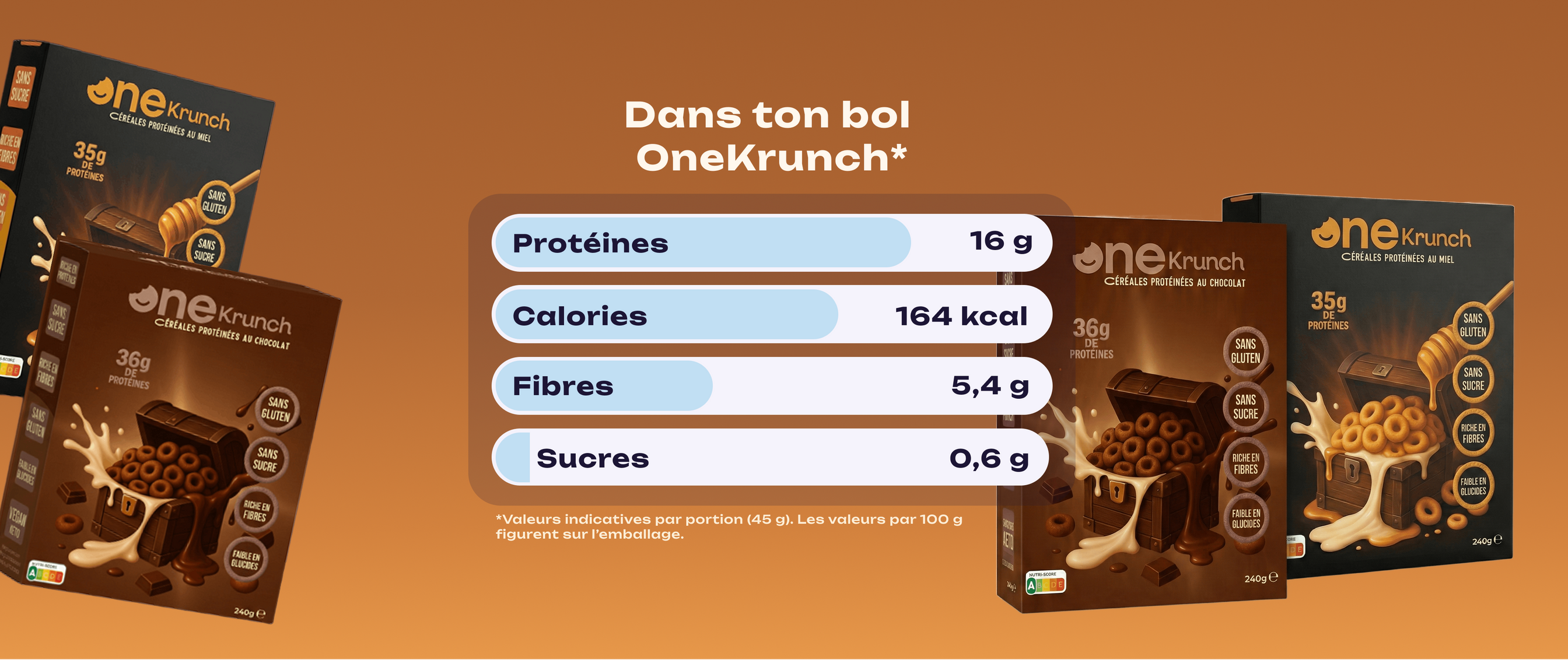 OneKrunch, c’est des céréales ultra gourmandes mais pensées comme un vrai snack fonctionnel : riches en protéines végétales, très peu sucrées, avec un Nutri-Score A. En gros, le plaisir d’un bol de céréales “enfant”, avec une recette d’adulte qui fait attention à sa santé.